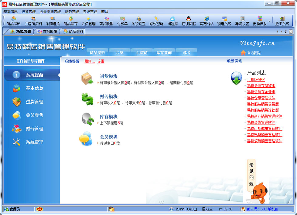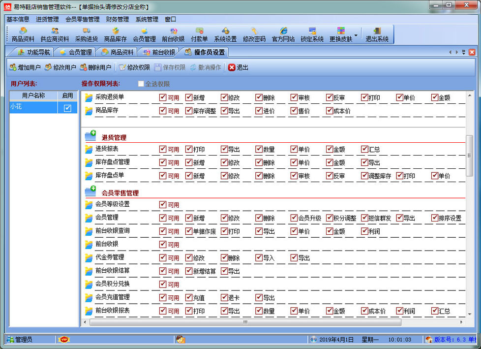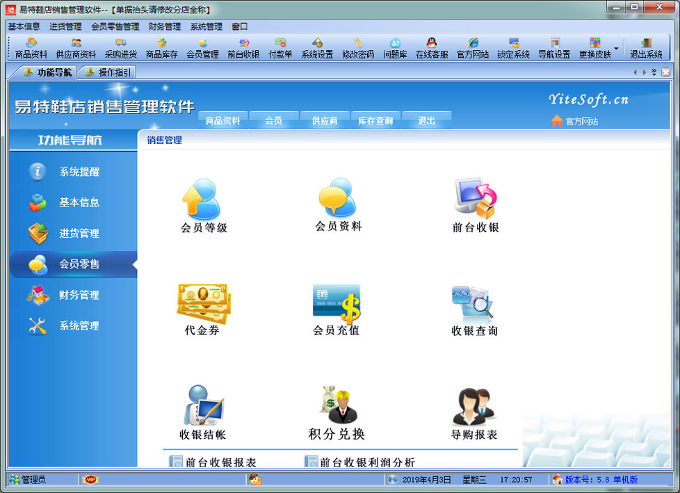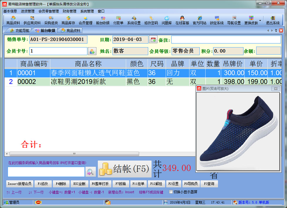 易特鞋店銷售管理軟件專門針對鞋店,內(nèi)衣,鞋帽店而設(shè)計的銷售管理軟件, 是一款較具有市場潛力的鞋店銷售軟件,結(jié)構(gòu)明晰,操作簡單,對店鋪商品的進(jìn)銷存能很好地管理,讓你的經(jīng)營帳目清清楚楚。獨(dú)創(chuàng)的顏色尺碼處理技術(shù),可以輕松應(yīng)對各種顏色尺碼。 適用對象:鞋店\內(nèi)衣\鞋帽(專賣店\非賣店模式)、小規(guī)模個體工商戶的。 功能簡介 二、增強(qiáng)功能:會員管理、前臺收銀,短信群發(fā) 三、軟件特色: 1)方便處理顏色尺碼,可以同樣應(yīng)用顏色+顏色組,尺碼+尺碼組 1、支持POS銷售?梢愿鶕(jù)需要選配打印機(jī)、讀卡器、會員卡、條碼槍、錢箱、顧客顯示屏及小票打印機(jī);可以根據(jù)自已喜好設(shè)計各種有特性的打印格式。銷售時可以適時掌握每一個商品的當(dāng)前庫存數(shù),銷售成本、銷售毛利; 2、會員管理?稍O(shè)置會員級別,不同級別可以適用不同的價格與折扣.可以自動計算會員的累計消費(fèi)、累計積分、兌現(xiàn)積分及剩余積分情況。過生日的會員可自動提醒; 3、在選擇商品時可以多選,即可以一次可以選擇多個商品; 4、可以設(shè)置單價、數(shù)量及銷售金額的核算精度即設(shè)置小數(shù)點(diǎn)位數(shù); 5、可以適時顯示往來單位(供貨商)的應(yīng)付帳款、預(yù)付帳款; 6、無處不在的顯示商品圖片的功能.支持圖片存放數(shù)據(jù)庫中,也可以存放軟件目錄文件夾中; 7、支持手工盤點(diǎn)(直接輸入需要盤點(diǎn)的商品)、自動盤點(diǎn)(直接按商品類別提取庫存)及盤點(diǎn)機(jī)盤點(diǎn); 8、權(quán)限設(shè)置功能強(qiáng)大.可以設(shè)置每個員工的菜單操作權(quán)、單據(jù)操作權(quán)、操作權(quán)及其他操作權(quán)限{比如:查看成本權(quán)(即能不能看到進(jìn)價及毛利)、售價調(diào)整權(quán)(即能不能在銷售時修改售價及折扣)等}; 9、支持?jǐn)?shù)據(jù)導(dǎo)入導(dǎo)出(比如:從其它軟件中導(dǎo)入期初庫存,商品資料,客戶,供應(yīng)商,會員等...... 10、 單據(jù)支持自定義設(shè)計格式、打印前預(yù)覽,并且可以導(dǎo)出為Excel文件,然后根據(jù)您的實際需要進(jìn)行特別編排處理; 11、功能強(qiáng)大的各類統(tǒng)計報表,為您提供詳盡的營業(yè)報告,讓您對商品進(jìn)、銷、存及利潤等財務(wù)狀況了如指掌; 12、升級智能化。您只需輕點(diǎn)鼠標(biāo),便可通過互聯(lián)網(wǎng)實現(xiàn)軟件的升級,免除您升級之苦。