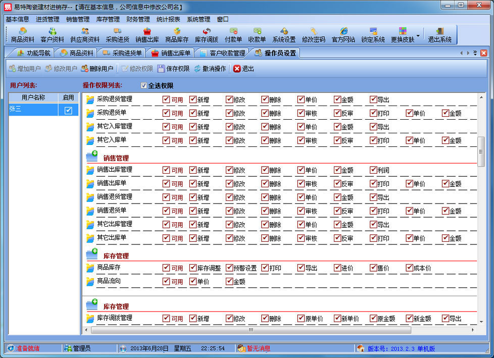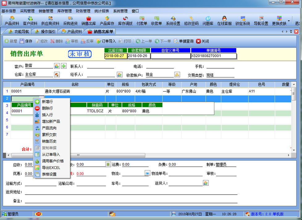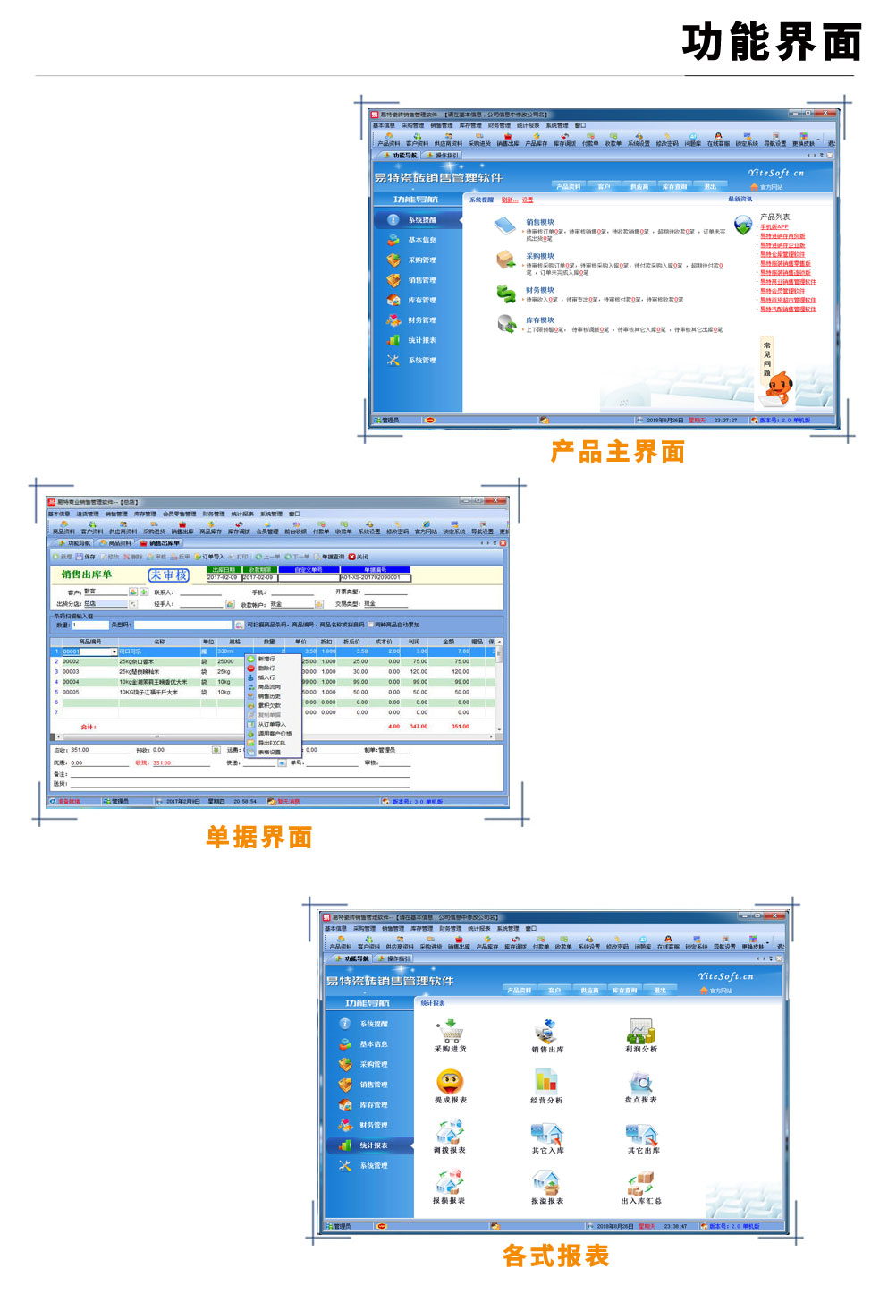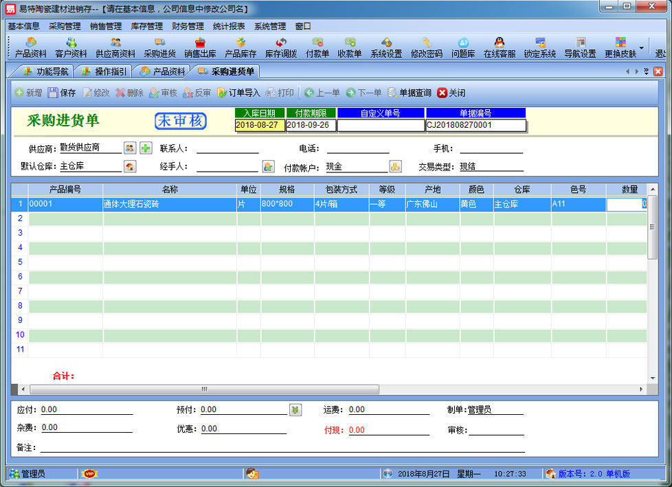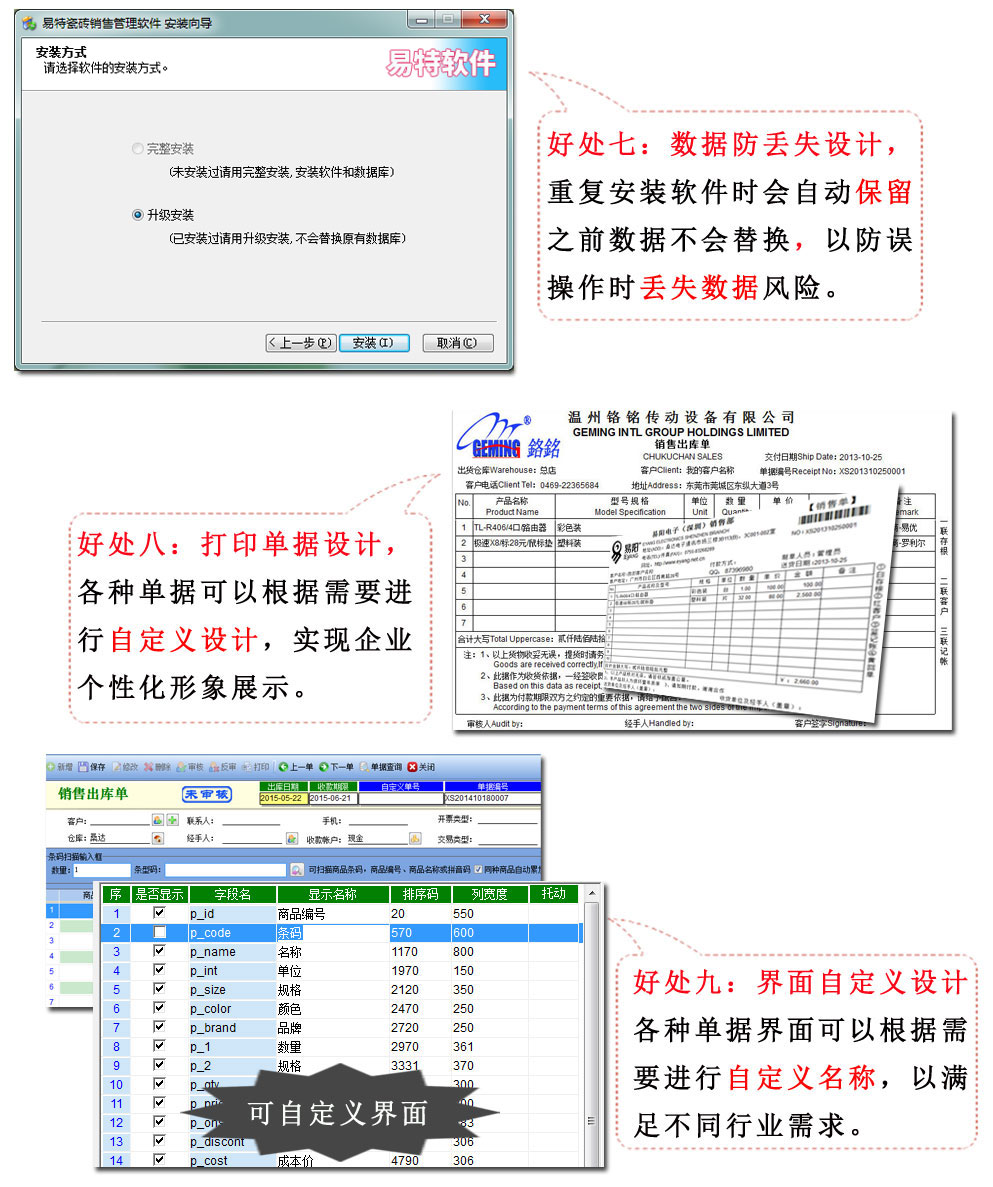 | 易特陶瓷建材進(jìn)銷存是一款專業(yè)的瓷磚,建材銷售管理軟件,針對(duì)陶瓷建材行業(yè)的特點(diǎn)設(shè)計(jì),如瓷磚的色號(hào)管理,其中包含商品銷售管理系統(tǒng) ,庫(kù)存管理系統(tǒng)(倉(cāng)庫(kù)管理系統(tǒng)),財(cái)務(wù)和報(bào)表系統(tǒng)等子模塊。軟件界面設(shè)計(jì)簡(jiǎn)潔,美觀,其人性化的軟件流程,使普通用戶不需培訓(xùn)也能很快掌握軟件操作使用方法,上手極易。強(qiáng)大報(bào)表與集成查詢功能是本軟件的最大特色,所有功能在用戶需要的使用地方自然體現(xiàn),不用打開多個(gè)窗口重復(fù)查詢。易特進(jìn)銷存軟件廣泛適用于企業(yè),商貿(mào)公司,個(gè)體門店等用于商業(yè)銷售管理, 庫(kù)存管理,財(cái)務(wù)管理等,客戶管理,員工管理等場(chǎng)合,是您企業(yè)進(jìn)行信息化管理的強(qiáng)大工具。 基礎(chǔ)數(shù)據(jù):商品信息,供應(yīng)商,客戶,商品分類,倉(cāng)庫(kù),銀行等基本信息的設(shè)置。 入庫(kù)管理:進(jìn)行貨品采購(gòu)入庫(kù),采購(gòu)?fù)素洠M(jìn)貨單據(jù)和退貨單據(jù)查詢,供應(yīng)商往來(lái)帳務(wù),供應(yīng)商付款。 出庫(kù)管理:銷售出貨,客戶退貨,銷售單據(jù)和客戶退貨查詢,客戶往來(lái)帳務(wù),客戶付款。 庫(kù)存管理:包括庫(kù)存之間貨品調(diào)拔,庫(kù)存報(bào)損、報(bào)溢,庫(kù)存盤點(diǎn)功能。 統(tǒng)計(jì)報(bào)表:完整的統(tǒng)計(jì)查詢功能,每張單據(jù)每次業(yè)務(wù)金額都可以清楚的反映。 權(quán)限管理:可添加刪除系統(tǒng)操作員帳號(hào),強(qiáng)大的權(quán)限控制,可以設(shè)置某用戶對(duì)某窗口某個(gè)按鈕的權(quán)限。 打印設(shè)計(jì):可對(duì)系統(tǒng)內(nèi)每個(gè)單據(jù)進(jìn)行打印的格式設(shè)計(jì),可以導(dǎo)出,導(dǎo)入,每個(gè)操作員可設(shè)計(jì)自己的打印格式。 界面設(shè)計(jì):系統(tǒng)窗口界面名稱可以自定義設(shè)計(jì),表格的顯示順序,寬度,是否顯示等,每個(gè)操作員可以設(shè)計(jì)自己的界面。 系統(tǒng)設(shè)置:可以靈活設(shè)置系統(tǒng)小數(shù)位數(shù),可選0-6位,讓帳務(wù)更精確,可對(duì)以往數(shù)據(jù)進(jìn)行選擇性的清除,以便系統(tǒng)初始化。 數(shù)據(jù)備份:可隨時(shí)對(duì)系統(tǒng)數(shù)據(jù)庫(kù)進(jìn)行安全備份,以防數(shù)據(jù)丟失。 |
