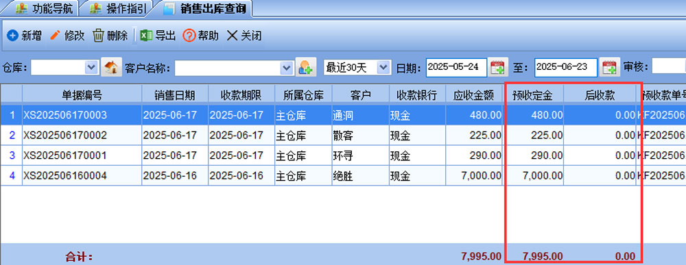 【回款總額】,是指在【參數(shù)設置】的時間范圍內,對應的銷售出庫單中,預收金額與后收款金額的總和。