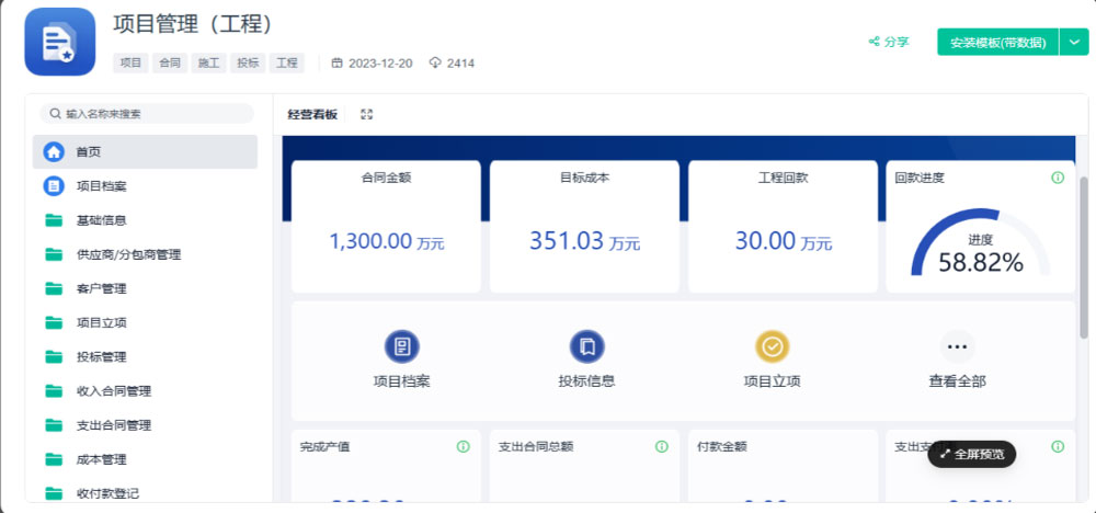 物資需求計劃、采購入庫、費用結算等一系列采購生命周期的管理。可建立一站式采購詢問價,高效篩選供應商,實現(xiàn)快速報價,提升采購效率。還可建立多維度控制,實現(xiàn)線上預算控制,避免成本暴漲,保障項目利潤可控。