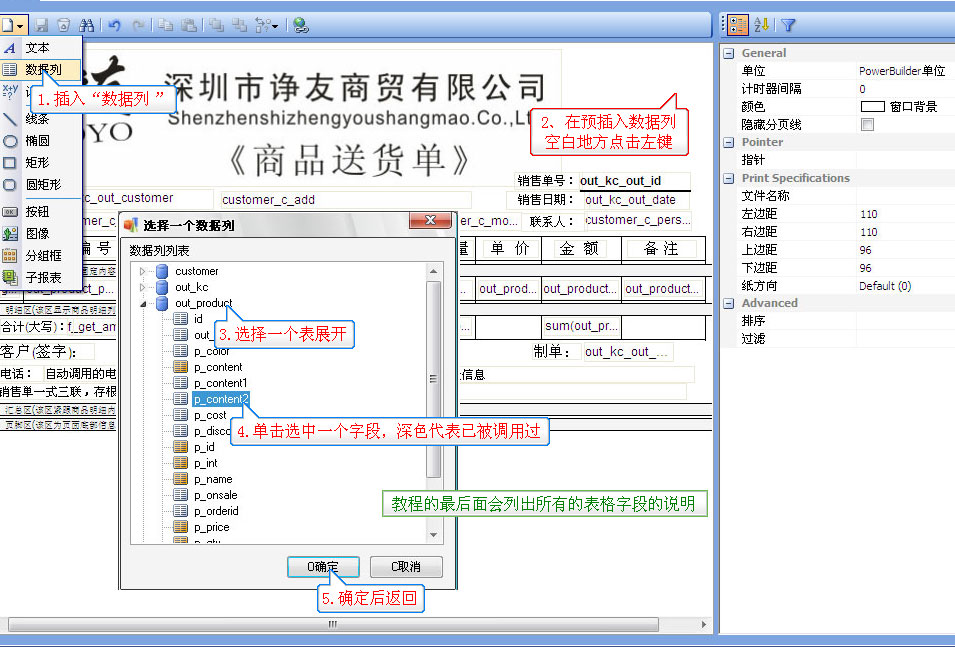 操作說明:可以根據(jù)需要插入一些對像,如數(shù)據(jù)庫的字段,線條,公司LOGO等打印,如上圖點(diǎn)擊“新增”按鈕打開菜單,選中“數(shù)據(jù)列”,在空白處單擊,會彈出圖上所示的窗口選一個后確定即可