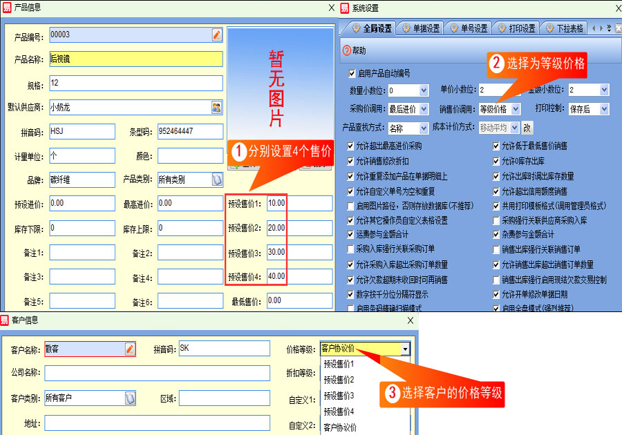 一、當(dāng)【系統(tǒng)設(shè)置】中的【銷售價(jià)調(diào)用】選擇為【等級(jí)價(jià)格】時(shí),在【產(chǎn)品資料】窗口,可以分別輸入4個(gè)不同的【預(yù)設(shè)售價(jià)】。對(duì)應(yīng)客戶資料里面的四個(gè)價(jià)格等級(jí),可以設(shè)置不同的客戶價(jià)格等級(jí),分別調(diào)用對(duì)應(yīng)的預(yù)設(shè)售價(jià)進(jìn)行銷售開單。