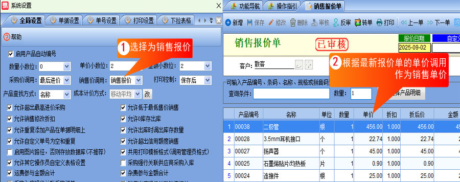 三、在【系統(tǒng)設(shè)置】中的【銷售價(jià)調(diào)用】選擇為【銷售報(bào)價(jià)】時(shí),通過前面錄入過的銷售報(bào)價(jià)單存檔,自動(dòng)調(diào)用最新報(bào)價(jià)單中的價(jià)格進(jìn)行銷售開單。