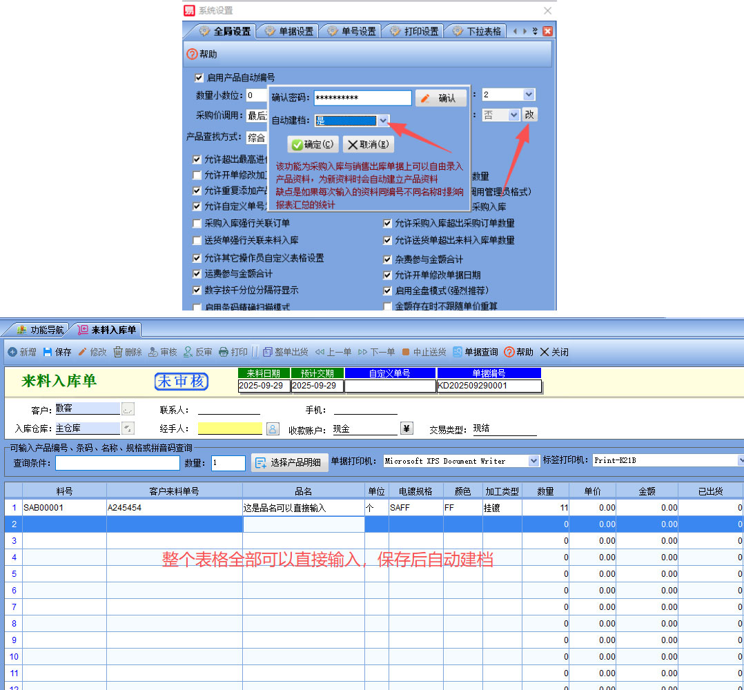 2.打開來料入庫單,整個表格所有的項都可以手動輸入,保存單據(jù)后,產(chǎn)品資料自動就建立好了,下次有同樣的,直接可以選擇開單。