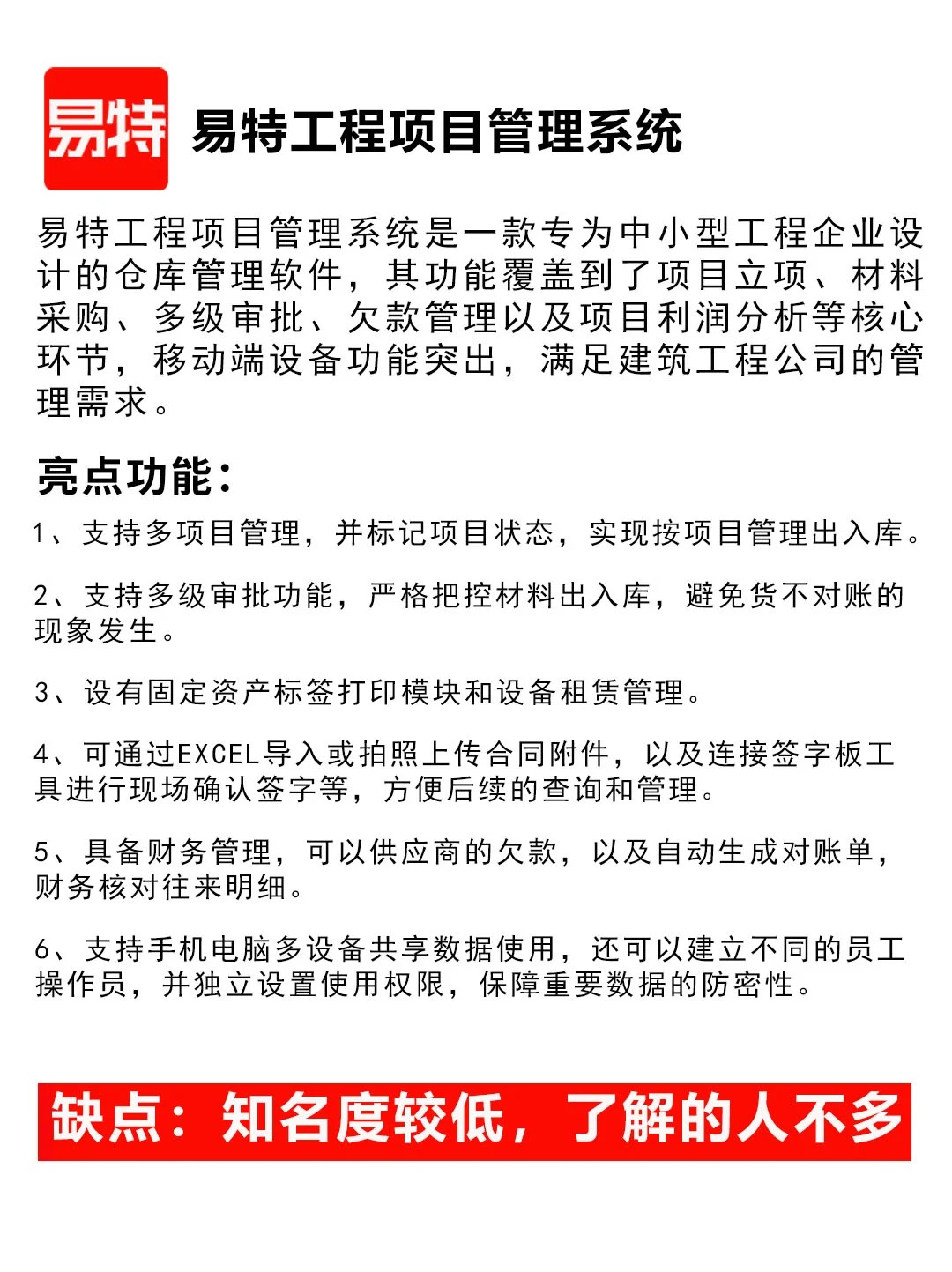 易特工程項目管理系統(tǒng)是一-款專為中小型工程企業(yè)設(shè)計的倉庫管理軟件,其功能覆蓋到了項目立項、材料采購、多級審批、欠款管理以及項目利潤分析等核心環(huán)節(jié)。移動端設(shè)備功能突出,滿足建筑工程公司的管理需求。