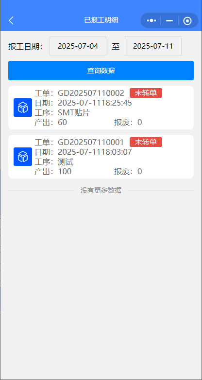 七、【生產(chǎn)管理】-【掃碼報(bào)工統(tǒng)計(jì)】可以看到掃碼報(bào)工的明細(xì),可以選擇某個(gè)員工的查詢,最后打勾,點(diǎn)擊【轉(zhuǎn)計(jì)件工資】則生成計(jì)件工資單,