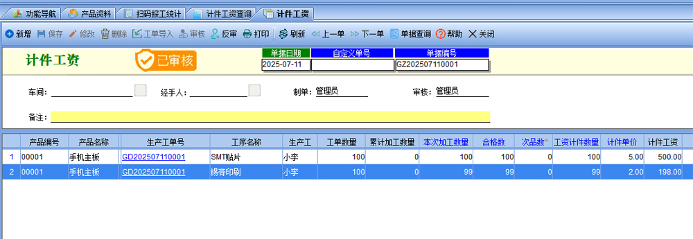 九、【生產(chǎn)管理】-【計(jì)件工資查詢】可以看到掃碼報(bào)工轉(zhuǎn)入進(jìn)來的計(jì)件工資,可以對(duì)報(bào)工的內(nèi)容再進(jìn)行修改,數(shù)量,計(jì)件單價(jià)都可以修改,最終審核以后