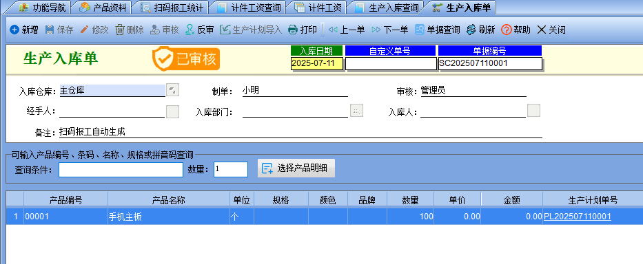 八、【生產(chǎn)管理】-【生產(chǎn)入庫查詢】如果設(shè)置了報(bào)工完成后自動(dòng)生成成品入庫單,則最后一個(gè)工序完工后,自動(dòng)生成一張生產(chǎn)入庫單,打開審核后則增加成品的庫存。