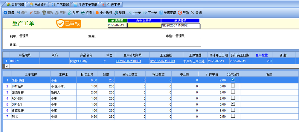 四、【生產(chǎn)管理】-【生產(chǎn)工單】,可以手動(dòng)創(chuàng)建一個(gè)工單,選擇產(chǎn)品后,自動(dòng)根據(jù)當(dāng)前產(chǎn)品的工藝路線帶出工序,也可以手動(dòng)修改工序及生產(chǎn)工和各項(xiàng)參數(shù)。
