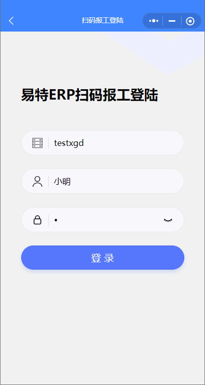 六、員工手機(jī)報(bào)工,打開小程序或是手機(jī)APP,點(diǎn)擊底部的【掃碼報(bào)工】進(jìn)到報(bào)工登陸界面,輸入剛才的員工姓名和密碼登陸,默認(rèn)進(jìn)來后