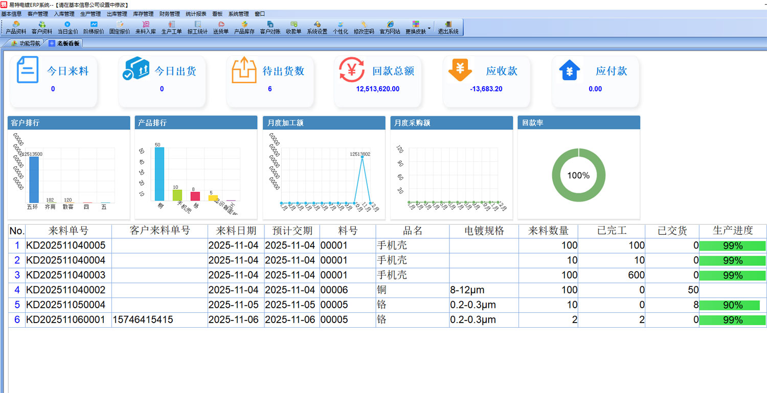 除了對(duì)生產(chǎn)過程的智能管控,易特電鍍ERP系統(tǒng),還能對(duì)產(chǎn)品、客戶、供應(yīng)商、部門、員工等基礎(chǔ)的信息集中錄入,統(tǒng)一管理維護(hù),確保數(shù)據(jù)的準(zhǔn)確性,便于查詢使用。此外還擁有財(cái)務(wù)管理,可以管理供應(yīng)商和客戶欠款,自動(dòng)生成對(duì)賬單做收付欠款處理等。同時(shí)還擁有老板看板、生產(chǎn)看板兩大重要的數(shù)據(jù)看板。通過看板的呈現(xiàn),將系統(tǒng)各處的數(shù)據(jù)集中顯示,實(shí)現(xiàn)數(shù)據(jù)可視化,可以輔助決策等。