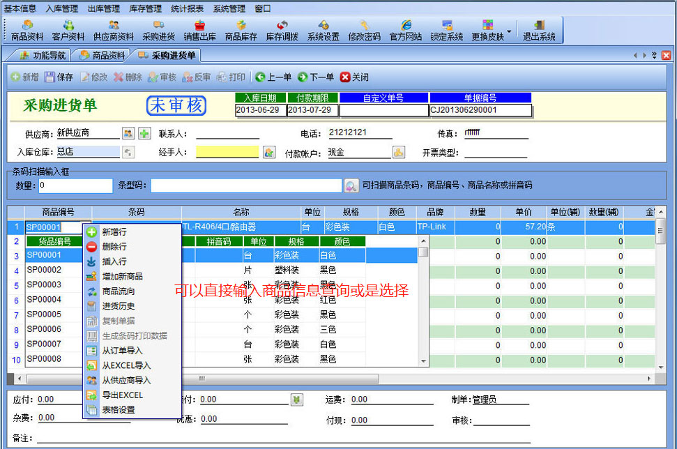 東西采購回來時(shí),可以用采購入庫單進(jìn)行處理操作: