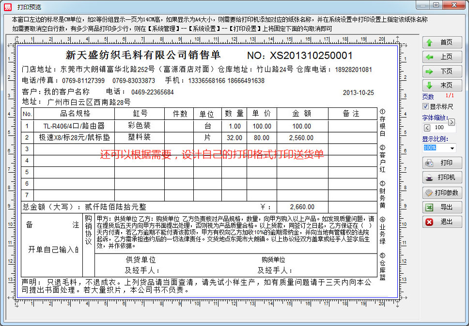 單據(jù)保存后可以直接點(diǎn)擊【打印】按鈕進(jìn)行打印單據(jù)輸出,打印格式是可以根據(jù)自己的需要而設(shè)計(jì)的