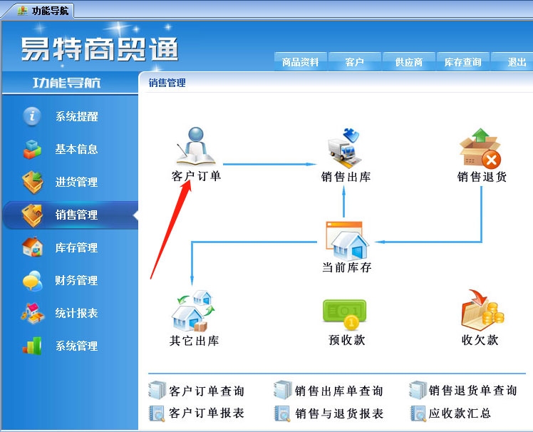 易特進銷存軟件商貿(mào)版有采購訂單和客訂單功能,可以關(guān)聯(lián)訂單的進度進行采購和銷售出庫,下面以客戶訂單到銷售出庫為例說明一下,采購訂單與采購入庫功能操作方法相同。