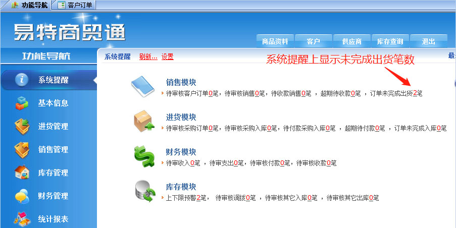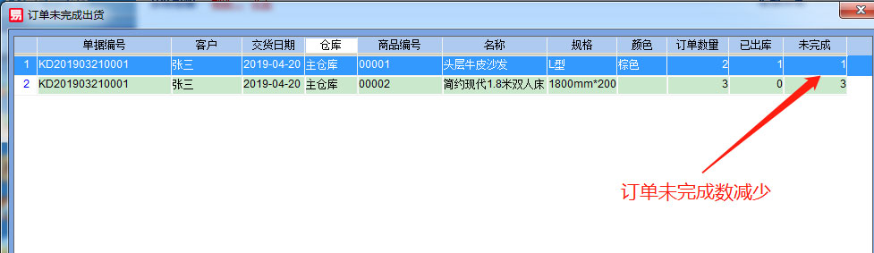 出貨完成后從【系統(tǒng)提醒】上打開的訂單未完成出貨數(shù)量的數(shù)量自動減少,出完貨以后則自動從系統(tǒng)提醒上消失。