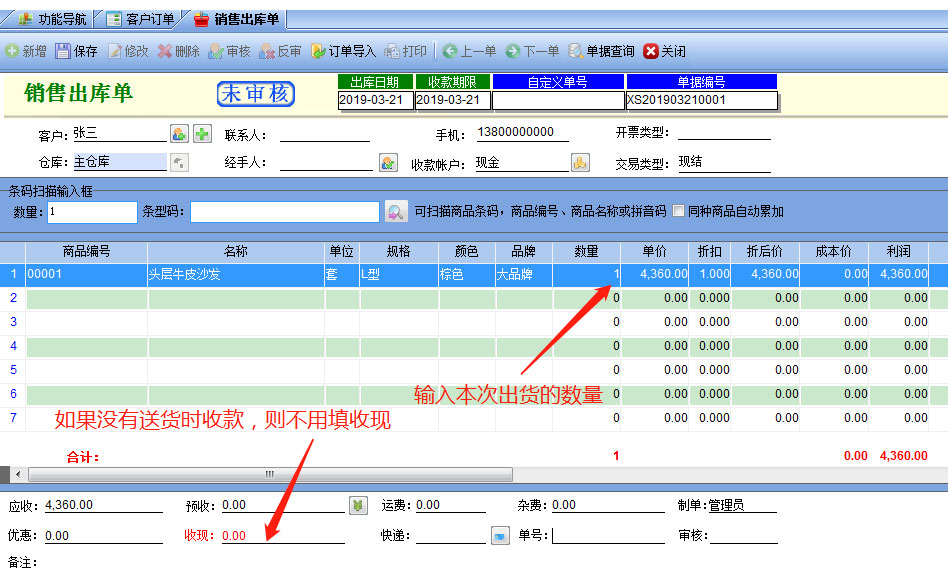 第二步:訂單的貨物到位后要出貨時,可以用【銷售出庫單】,點擊【銷售管理】模塊中【銷售出庫】則自動建立一個新的銷售單,要選擇和訂貨時相同的