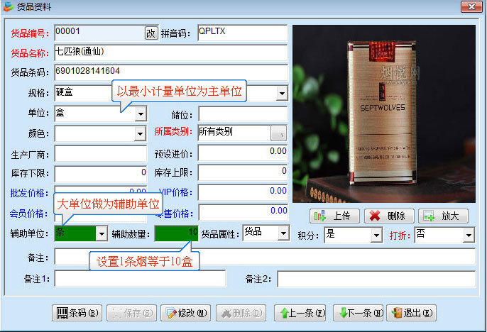 該例以煙為例,主單位是盒,輔單位是條,設(shè)置10盒為一條煙。