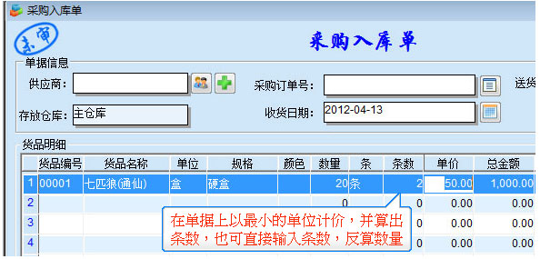 3、出入庫(kù)單據(jù)上輸入條數(shù),或是盒數(shù),均可自動(dòng)換算,系統(tǒng)實(shí)則以主單位來(lái)計(jì)價(jià)。