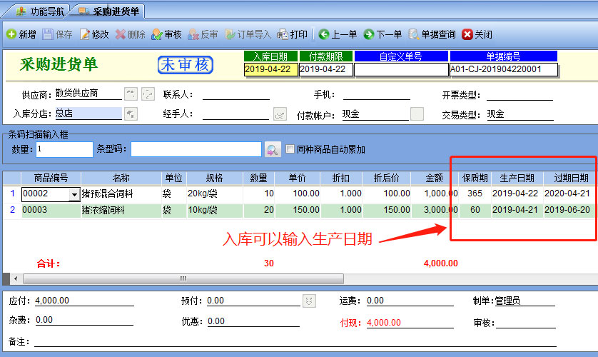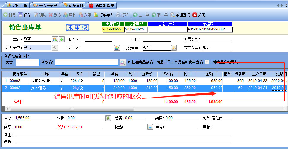 在使用過程中,用戶可以在采購入庫時輸入生產(chǎn)日期,系統(tǒng)便會自動計算出飼料的過期日期。而在銷售時,用戶還可以根據(jù)生產(chǎn)批次選擇合適的飼料進行銷售。這樣的設(shè)計不僅提高了工作效率,也有效預(yù)防了過期飼料的使用,確保了飼料的質(zhì)量和安全。