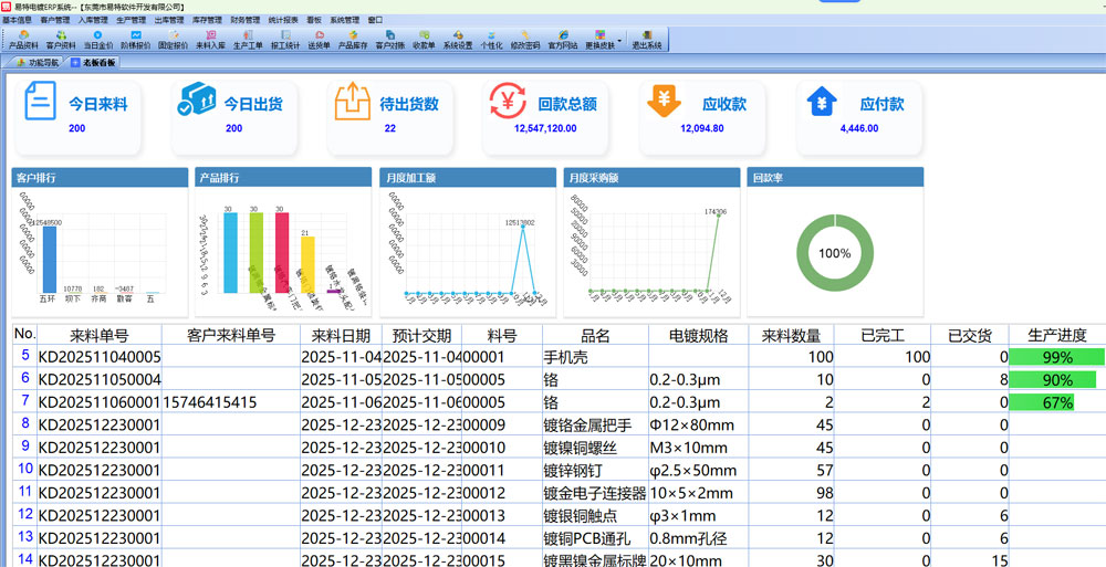 電鍍加工廠作為一種典型的來料加工企業(yè),其主要業(yè)務(wù)流程是接收客戶提供的材料,經(jīng)過一系列加工處理后再返回給客戶。這些原材料往往價值不菲,而傳統(tǒng)的管理模式往往難以準(zhǔn)確記錄庫存,導(dǎo)致工廠內(nèi)部可能遭受損失。然而,電鍍加工廠的管理模式與一般制造工廠有所不同,市面上的庫存管理軟件并不能有效解決其面臨的難題。因此,對于電鍍工廠的管理,我們推薦使用易特電鍍ERP系統(tǒng)。