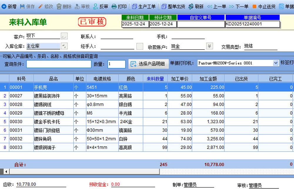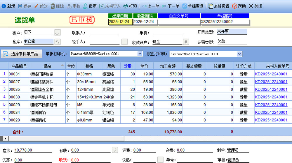 當(dāng)電鍍加工廠收到客戶產(chǎn)品時,可以通過來料入庫單進(jìn)行記錄,支持Excel數(shù)據(jù)導(dǎo)入,快速錄入系統(tǒng)。同時,可記錄客戶的來料單號,便于后續(xù)對賬。加工完成后,系統(tǒng)可生成送貨單,嚴(yán)格控制產(chǎn)品出貨,并關(guān)聯(lián)來料入庫單。對于分批送貨,系統(tǒng)允許查看產(chǎn)品出貨進(jìn)度和損耗率。系統(tǒng)還會根據(jù)入庫和送貨記錄自動更新庫存數(shù)量,確保工廠能夠?qū)崟r掌握庫存信息,有效控制損失。