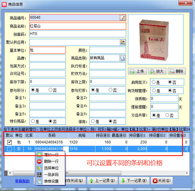 售都可以做到多單位自由選擇,還支持條碼掃描,如一包煙和一條煙的條碼是不同的,掃描后自動找出對應(yīng)的商品及銷售價格