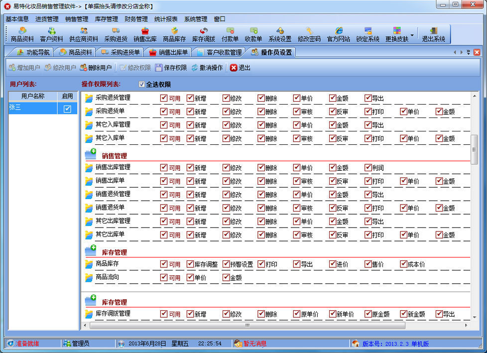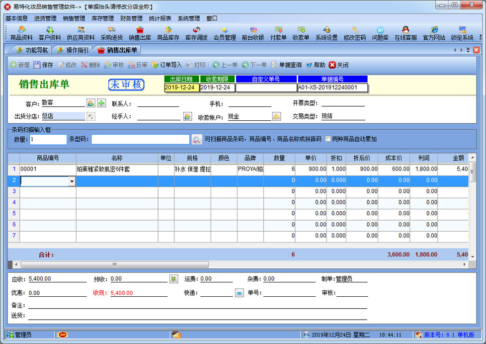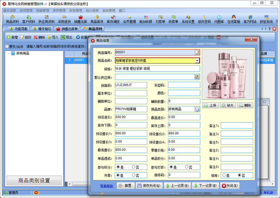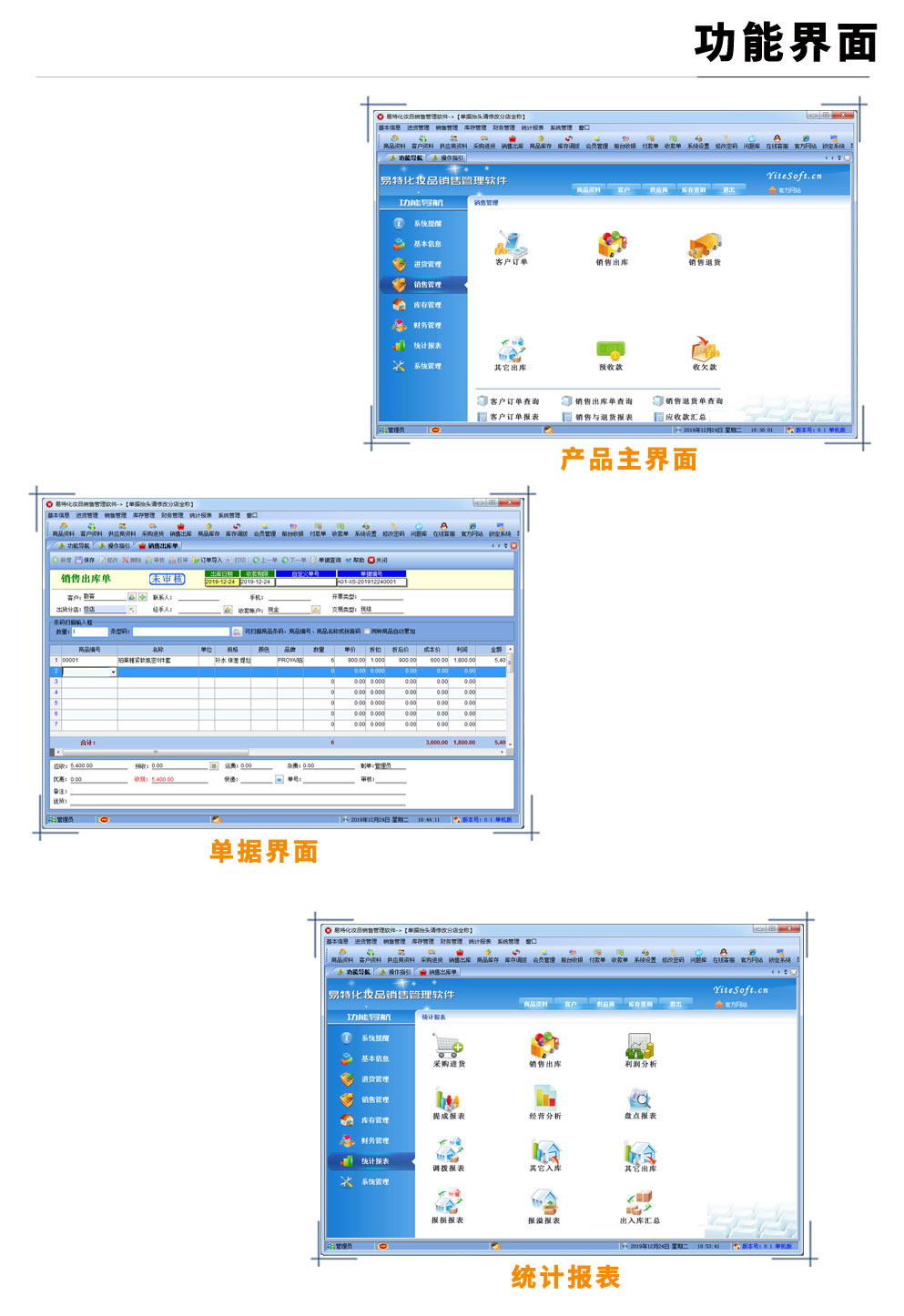 | 易特化妝品銷售管理軟件是一款專業(yè)的針對化妝品而設(shè)計(jì)的銷售管理軟件,完美解決化妝品行業(yè)的日常銷售管理。其中包含商品銷售管理系統(tǒng) ,庫存管理系統(tǒng)(倉庫管理系統(tǒng)),財(cái)務(wù)和報(bào)表系統(tǒng)等子模塊。軟件界面設(shè)計(jì)簡潔,美觀,其人性化的軟件流程,使普通用戶不需培訓(xùn)也能很快掌握軟件操作使用方法,上手極易。強(qiáng)大報(bào)表與集成查詢功能是本軟件的最大特色,所有功能在用戶需要的使用地方自然體現(xiàn),不用打開多個(gè)窗口重復(fù)查詢。易特進(jìn)銷存軟件廣泛適用于企業(yè),商貿(mào)公司,個(gè)體門店等用于商業(yè)銷售管理, 庫存管理,財(cái)務(wù)管理等,客戶管理,員工管理等場合,是您企業(yè)進(jìn)行信息化管理的強(qiáng)大工具。 基礎(chǔ)數(shù)據(jù):商品信息,供應(yīng)商,客戶,商品分類,倉庫,銀行等基本信息的設(shè)置。 入庫管理:進(jìn)行貨品采購入庫,采購?fù)素洠M(jìn)貨單據(jù)和退貨單據(jù)查詢,供應(yīng)商往來帳務(wù),供應(yīng)商付款。 出庫管理:銷售出貨,客戶退貨,銷售單據(jù)和客戶退貨查詢,客戶往來帳務(wù),客戶付款。 庫存管理:包括庫存之間貨品調(diào)拔,庫存報(bào)損、報(bào)溢,庫存盤點(diǎn)功能。 拆分組裝:整進(jìn)散出,或是整出散進(jìn)等可以自由的拆分組合產(chǎn)品。 統(tǒng)計(jì)報(bào)表:完整的統(tǒng)計(jì)查詢功能,每張單據(jù)每次業(yè)務(wù)金額都可以清楚的反映。 權(quán)限管理:可添加刪除系統(tǒng)操作員帳號(hào),強(qiáng)大的權(quán)限控制,可以設(shè)置某用戶對某窗口某個(gè)按鈕的權(quán)限。 打印設(shè)計(jì):可對系統(tǒng)內(nèi)每個(gè)單據(jù)進(jìn)行打印的格式設(shè)計(jì),可以導(dǎo)出,導(dǎo)入,每個(gè)操作員可設(shè)計(jì)自己的打印格式。 界面設(shè)計(jì):系統(tǒng)窗口界面名稱可以自定義設(shè)計(jì),表格的顯示順序,寬度,是否顯示等,每個(gè)操作員可以設(shè)計(jì)自己的界面。 系統(tǒng)設(shè)置:可以靈活設(shè)置系統(tǒng)小數(shù)位數(shù),可選0-6位,讓帳務(wù)更精確,可對以往數(shù)據(jù)進(jìn)行選擇性的清除,以便系統(tǒng)初始化。 數(shù)據(jù)備份:可隨時(shí)對系統(tǒng)數(shù)據(jù)庫進(jìn)行安全備份,以防數(shù)據(jù)丟失。 3、 屏幕分辨率800X600以 |
