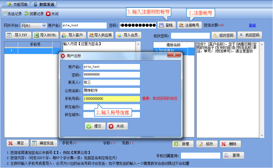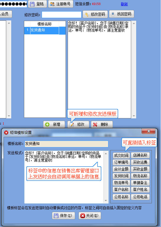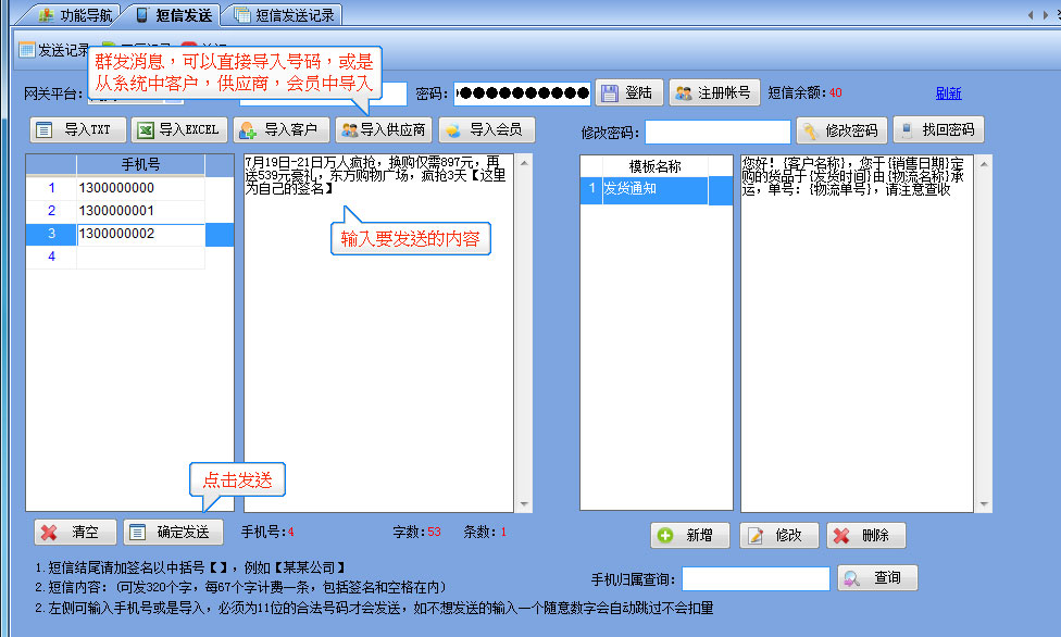 短信發(fā)送流程 1.【系統(tǒng)管理】-----【短信發(fā)送】-----打開如圖所示,注冊好帳號和密碼,然后輸入在界面上并點登陸,成功后會顯示短信余額為0 2.需要群發(fā)時直接可以導入已有的EXCEL表格,或是TXT格式的手機號,也可以從系統(tǒng)中將客戶或供應商等手機號直接導入后發(fā)送 3.發(fā)貨通知消息,可在客戶訂單管理及銷售出庫管理窗口上直接將當前單據的信息發(fā)給對應的客戶。 |