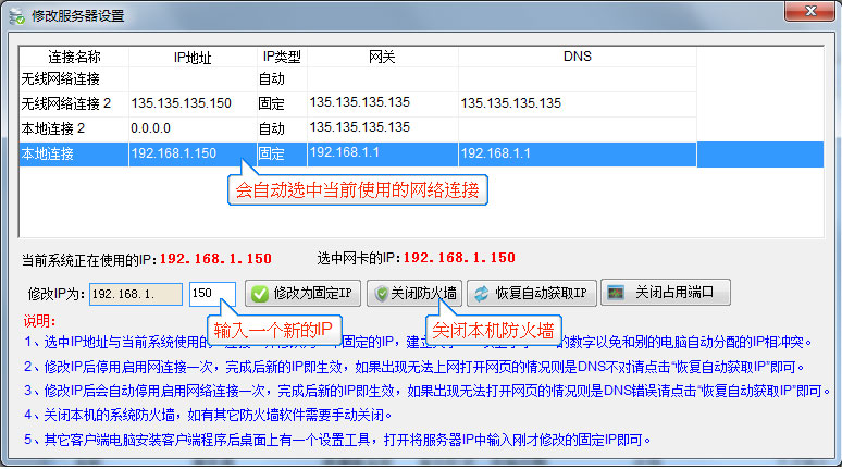 方案一:用IP連接(推薦),修改IP地址為固定的IP,點(diǎn)擊“更改設(shè)置”按鈕打開始下圖,如電腦上有多個(gè)網(wǎng)卡,會(huì)自動(dòng)選中當(dāng)前使用的網(wǎng)絡(luò)連接,